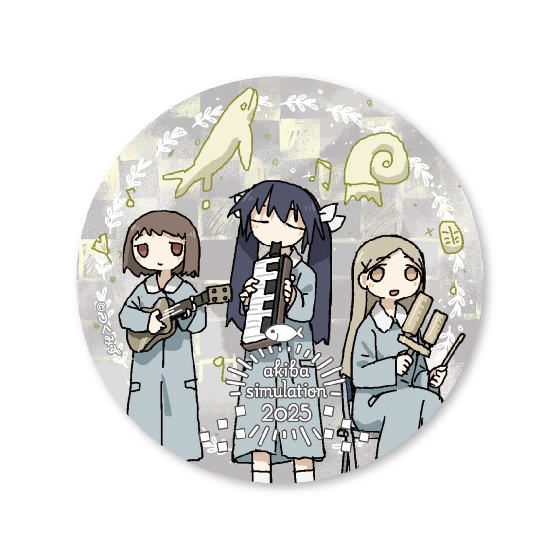 2024年12月20日〜2025年1月5日にボークス秋葉原ホビー天国2にて開催した シメジ シミュレーション 」イベント「アキバ シミュレーション 2025」の描き下ろしイラストを使用した缶バッジです。